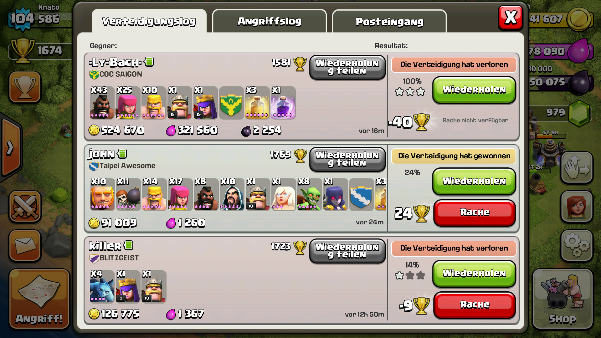 Dann kommt noch dazu, dass dann fürn Krieg jeder irgendwie Pekkas, Drachen oder Hexen haben will. Durch meine Kriegstruppen + Spenden geht mir bei jedem Krieg ca eine Million Elixier und ca 4 - 5k de drauf und soviel bekomm ich durch den Bonus dann doch nicht. Für einmal in der Woche ist das in Ordnung, ist ja nicht so, dass ich nicht gerne was spende, aber das füllen der Kriegs Burgen bleibt zum Teil auch oft an mir hängen (natürlich nicht alles, kann ja eh nur 5 pro Burg auffüllen), da manche dazu einfach zu geizig sind oder ganz einfach viel zu selten online sind *hust* unser Anführer *hust*