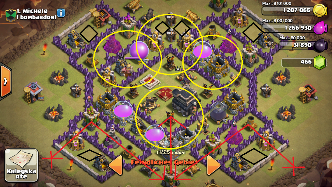 Die schwarzen Vierecke sind die möglichen Plätze von Riesenbomben, die roten Pfeile die Laufwege meiner Hogis und die gelben Kreise die Plätze, wo ich meine Heilzauber platziere.