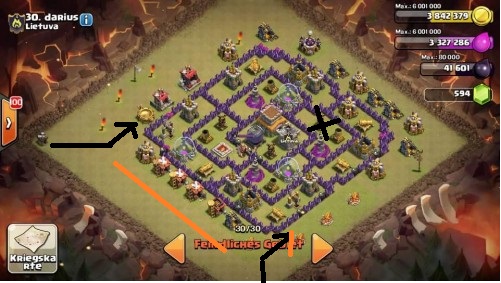 Mach selbst 8 Schweinis, die du im Südwesten so platzierst, dass die die LA angreifen. Die Lv3er LA blitzt du weg. Dann greifen 9 Drachen (8 eigene + 1x CB) die Rathausflanke an, wo die Mauern dunkellila sind. Die Armeelager nicht vergessen.