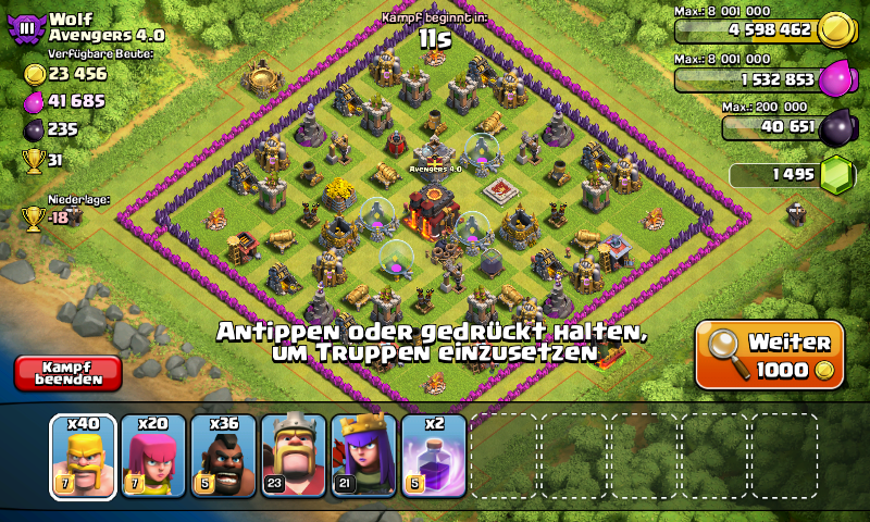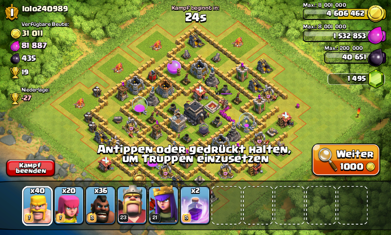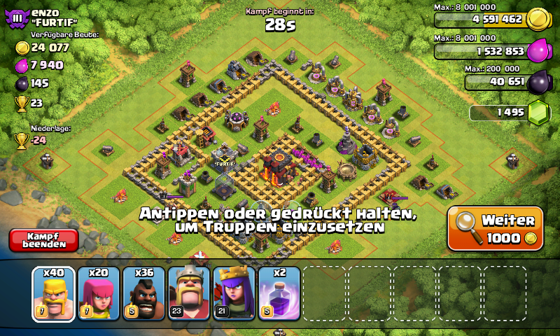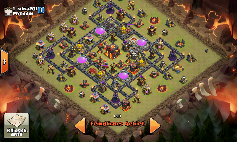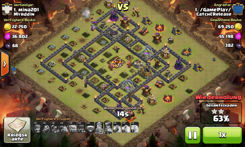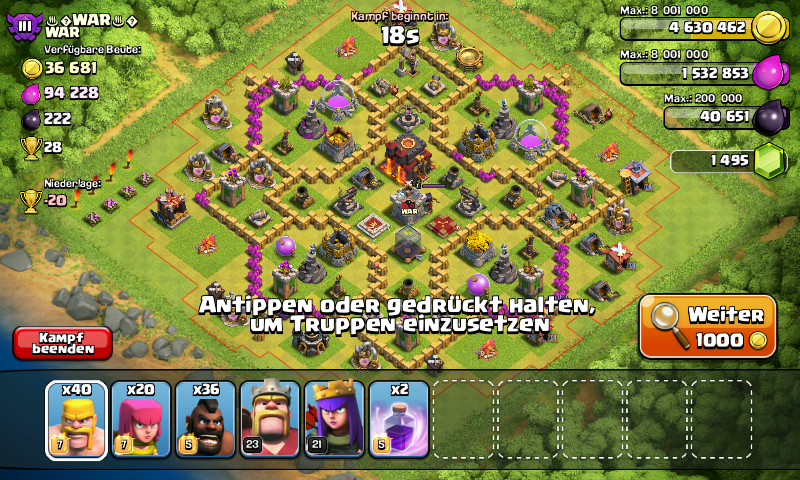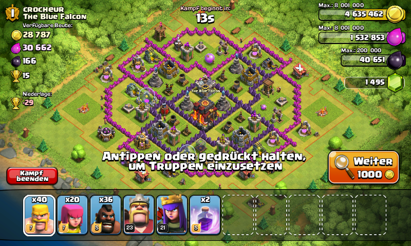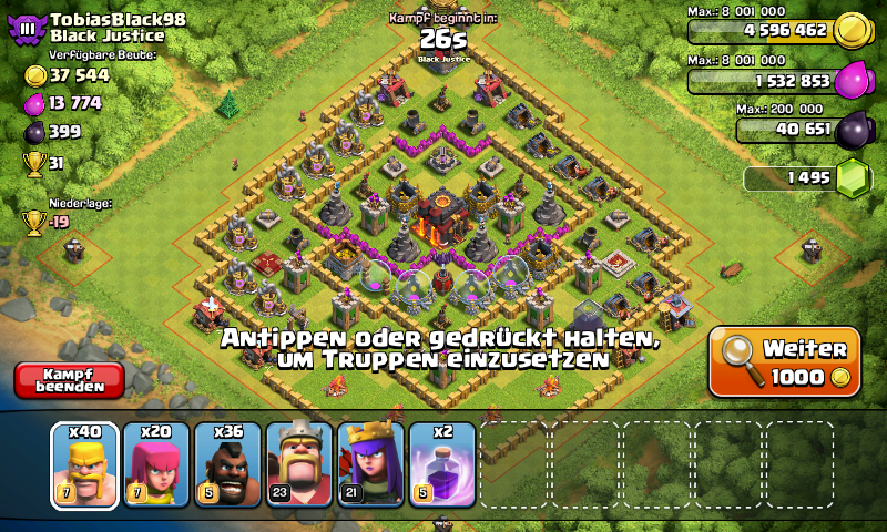 für drei Sterne reicht deine Truppenstärke leider nicht. Es wäre hilfreich wenn du wüsstest ob dein Gegener einen Drachen in der CC sitzen hat. Sollten kleinere Einheiten (Magier, Bogis, Barbaren etc.) in seiner CC sein nimmst du am besten einen Blitzzauber mit. Locke den CC-Inhalt so raus dass, die feindlichen Truppen zu einem Minenwerfer laufen. Sobald sie in etwa dort angekommen sind, wirfst du den Blitzzauber drauf. Da du kine Drachen besitzt, kannst du Riesen und Magier nutzen. Dazu nimmst du 20 Riesen, 20 Magier, 8 Mauerbrecher und 4 Bogis mit. Nachdem du die CC gelockt und zerstört hast (Sollte der Blitz nicht reichen, locke den Inhalt an eine der Bauhütten und setze, einen Riesen und ein paar Magier) setzt du unten, an der Windfegerseite deine Riesen. Aber nicht alle auf einen Fleck! Du solltest sie verteilen. Am besten du setzt erstmal einen an dem Elixiersammler zwischen den Mauern und dem Armeelager, ein weiteren jeweils vor, die Kanone, die Goldmine, das Goldlager und die andere Kanone. Somit siehst du ob da Fallen liegen. Nachdem sie die Mauern erreichen, setzt du die anderen Riesen, in etwa genauso verteilt, dahinter. Noch bevor diese die Mauern erreichen setzt du ein paar Mauerbrecher an die beiden Kanonen. Nachdem die Riesen reingelaufen sind, verteilst du dahinter 15 Magier. Es wird nicht lange dauern, dann rennen die Riesen in eine Riesenbombe (Zwischen dem Bogenturm und dem Minenwerfer). Nachdem sie explodiert ist, setzt du den Heil-Zauber. Achte darauf das du mit dem Ende des Zaubers, grade so die Rathaus-Mauern triffst. Da die Riesen direkt neben dem Minenwerfer stehen, wird dieser die Magier anvisieren. Daher muss der Zauber sie teilweise einschließen. Den Wutzauber setzt du, sobald die Magier das Rathaus anvisieren. Damit bekommst du es wahrscheinlich platt. Für die fehlenden Prozente, nutzt du die 4 Bogis für die Bauhütten, die Magier für die Kasernen-Seite und den King für die gegenüberliegende Seite. Damit sind zwei Sterne gesichert.