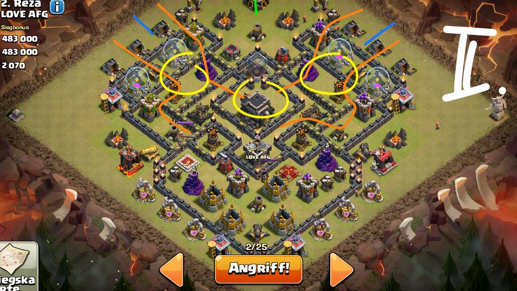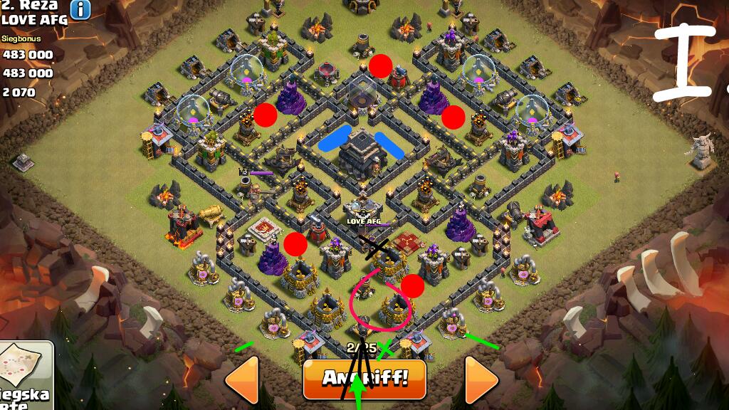 I. Du kannst es dir aussuchen ob du die cc ziehen willst oder nicht. Wenn nicht würd ich einen 2. eigenen golem mitnehmen (1 max im eigenen cc). Ich würd sie bei der südlichen kanone mit 2 loons ziehen und ein schwein nachschicken um sicher zu gehen dass alles raus ist. In den süden holen, 2 hexen, queen, ev. Poison,... Standard cc kill. (Schwarze striche, weiße punkte). -> golem rein -> funnel magier!! -> 3 mauerbrecher offset setzen (flächenschaden böse^^) -> könig setzen sobald der funnel steht -> wutzauber im bereich der ggn. Bogentante. Sobald die beschäftigt ist kannst mit dem 2. teil starten