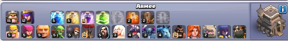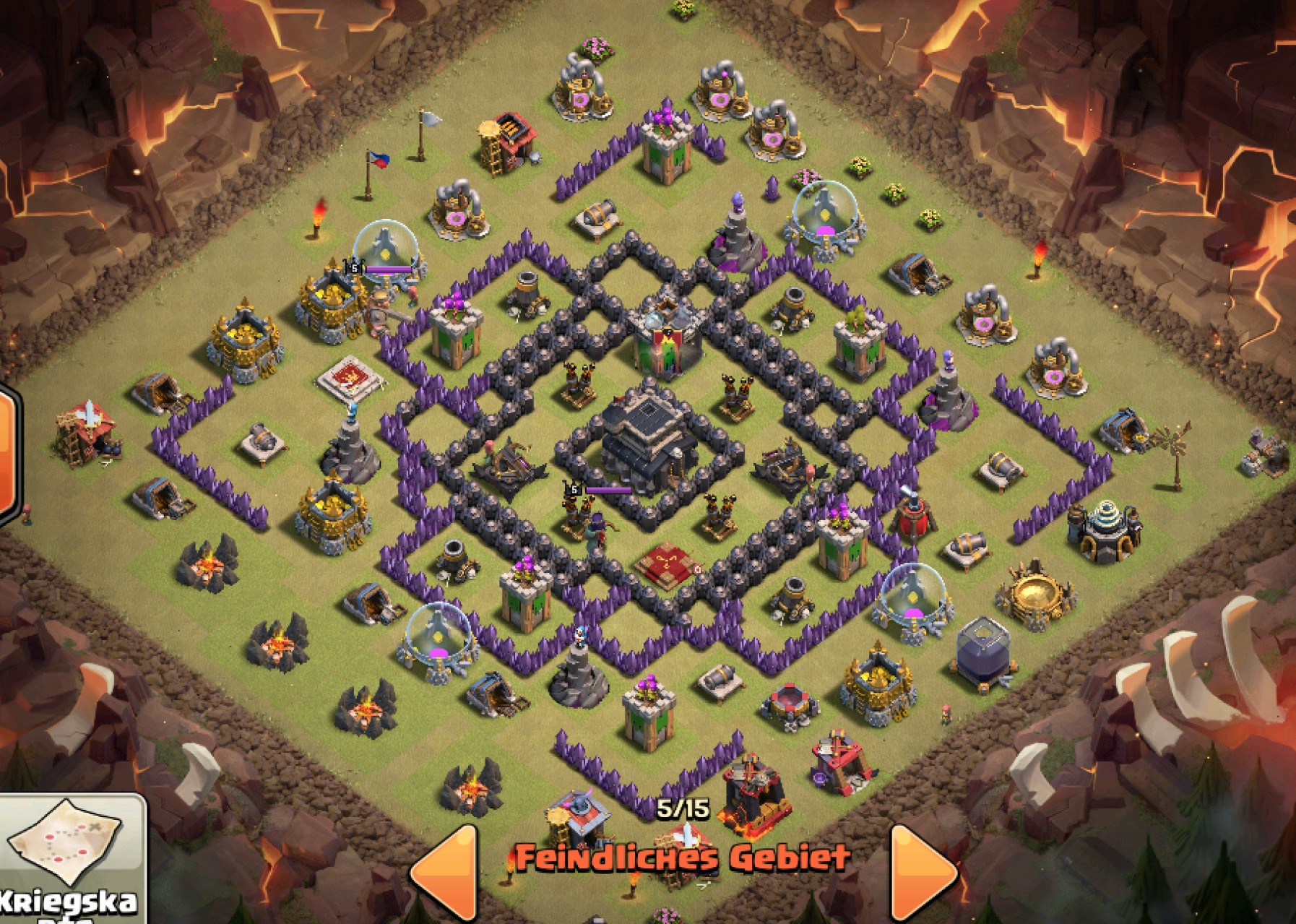 ich bin jetzt total maxed 8.5, mit Golem 4, Queen 13, King 14, Hunde lv2, hexe 1, 4 tesla lv 7 , 4 luft 7, alle (bis auf die kleinen Bomben!) Fallen gebaut und hoch usw, usw ...
