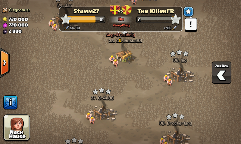 Beim 1. Angriff wurde es 1 Stern (sehr knapp), es wären auch locker 2 Sterne gewesen aber ein sehr nettes Mitglied aus meinem Clan dachte sich, es wäre kein Problem statt Schweine mal Barbaren zu spenden...