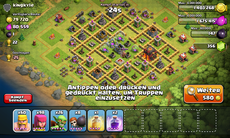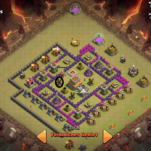 Lass dir in die Clanburg auch einen Drachen geben, und setze diesen auch eher unten/links.Truppen :