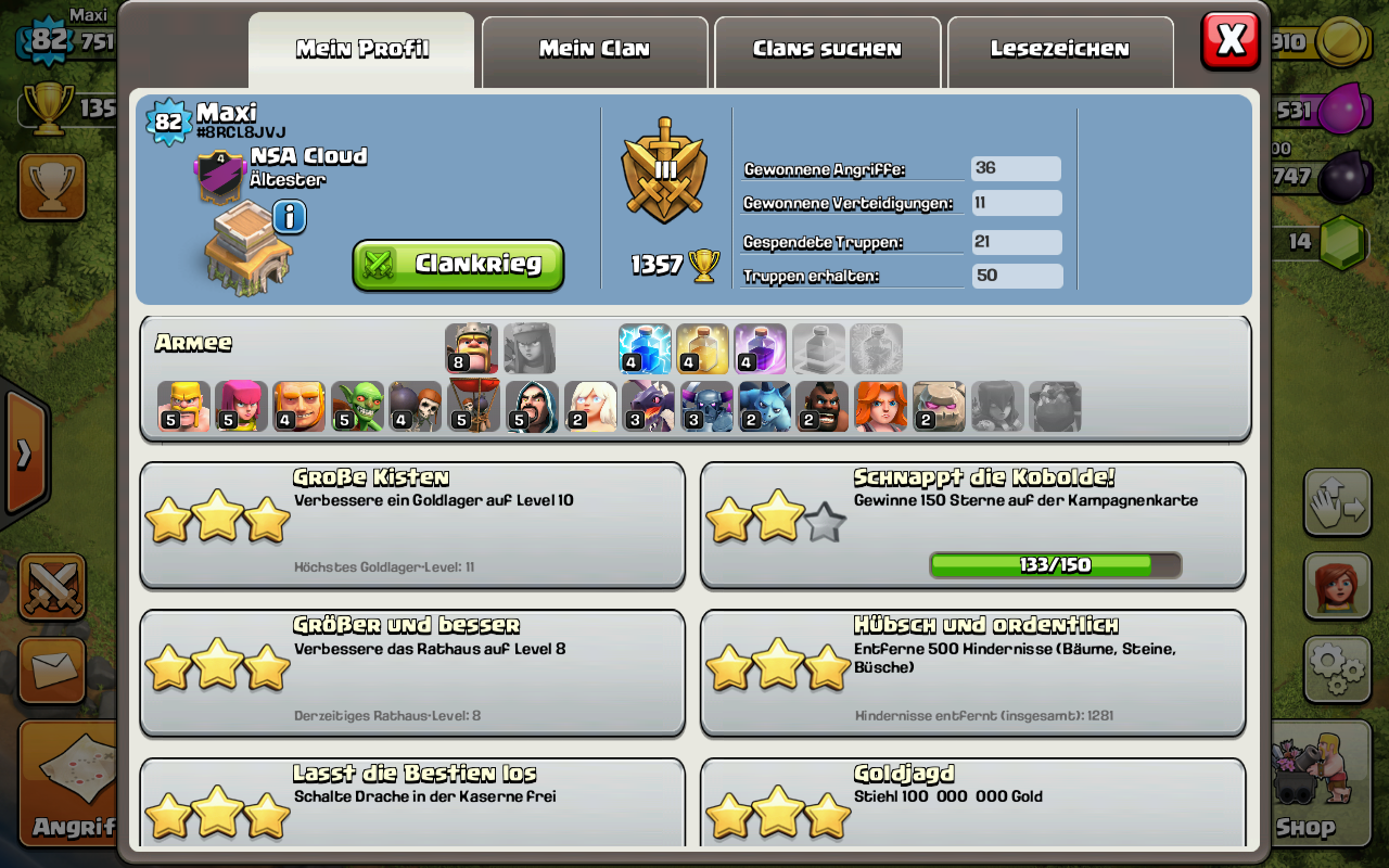 Ich bin fast maxed out, mir fehlen lediglich 3 Teslas, Mauern und ein paar Truppen.Nächste Vorhaben: