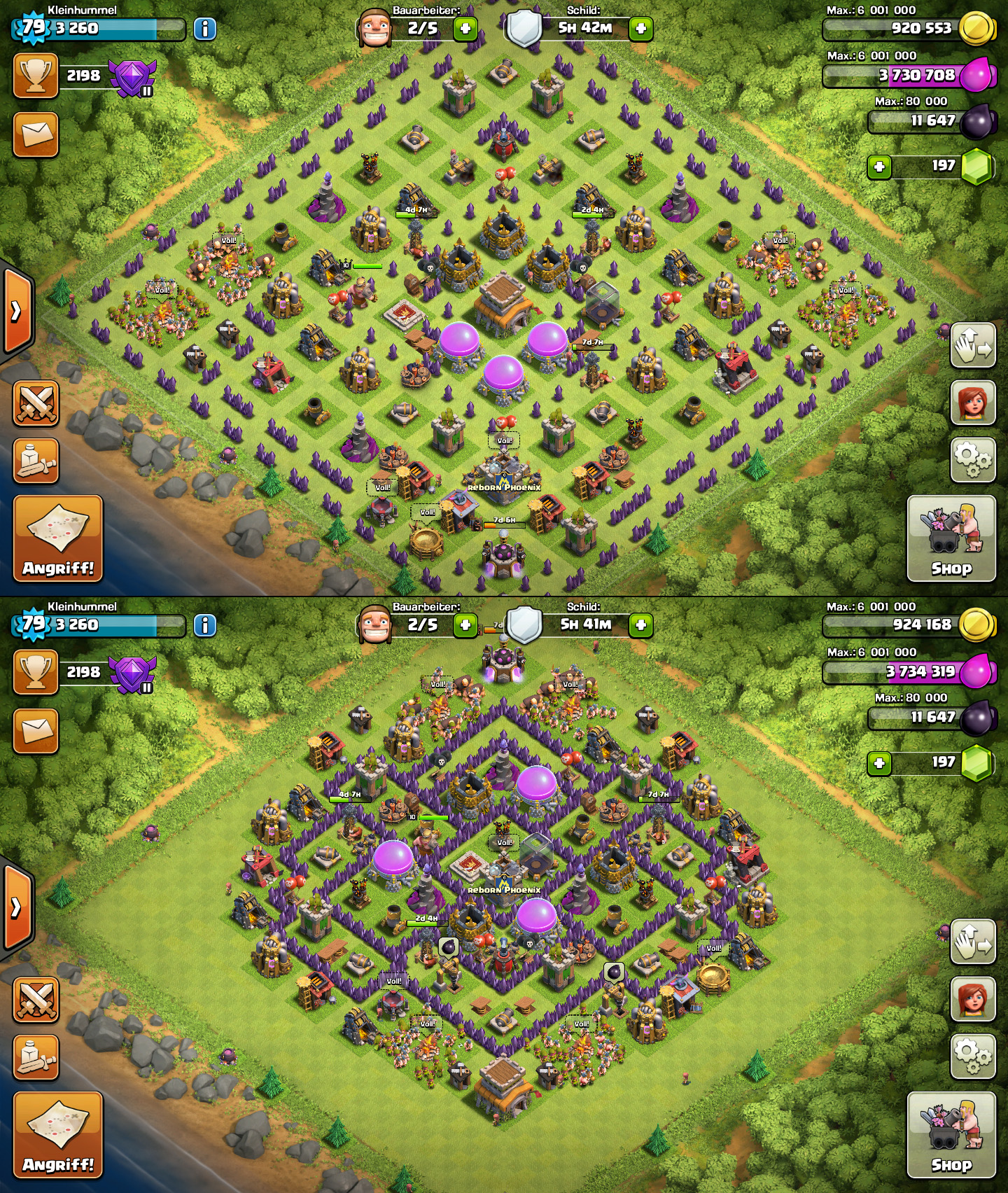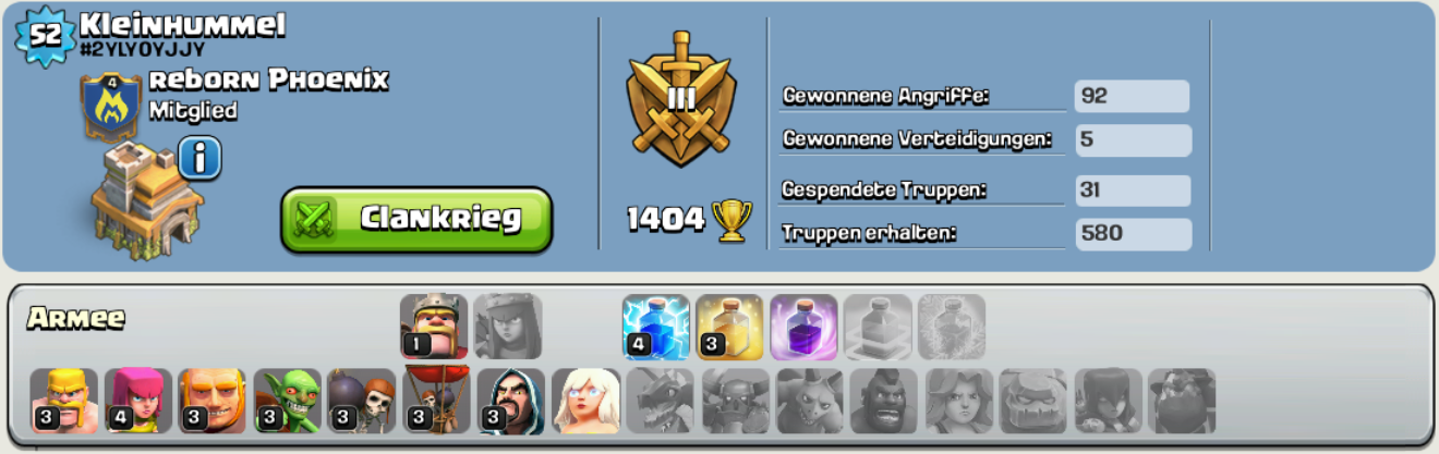 Ich habe ein Bild gepostet, auf dem man den Feind sieht und eins, auf dem mein Profil und meine Truppen zu sehen ist.WICHTIG: - Ich habe noch Wutzauber Stufe 1 zur Verfügung, da meine Zauberfabrik bis morgen LvL 3 ist.