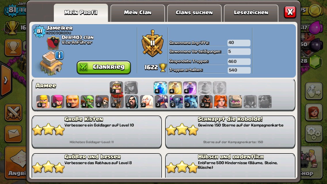 Wie du vielleicht siehst bin ich momentan die 1 in meinem Clan - Unterstützung aus der CB ist da eher mau! Und GoWi Pe klappt sehr unterschiedlich! Ich versuche mal 60 Bogenschützen 28 Hogs!