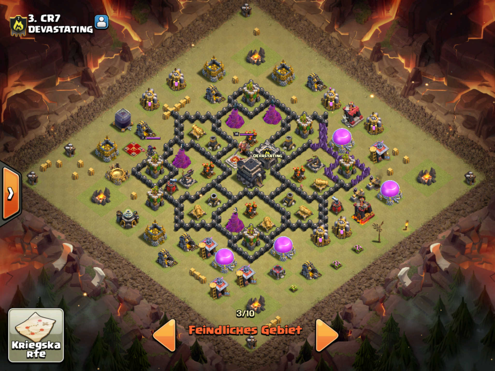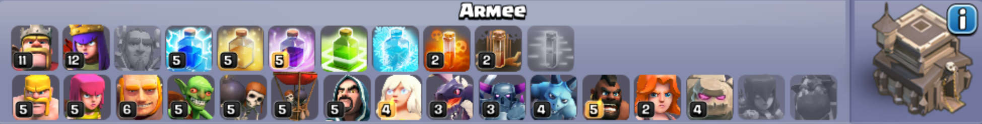 Mit Hogs versuch ich dann die beschäftigte Verteidigung auszuschalten.Alternativ: Ich zerstöre mit Magiern und der Queen die CB und hab in der CB einen max Golem mit.