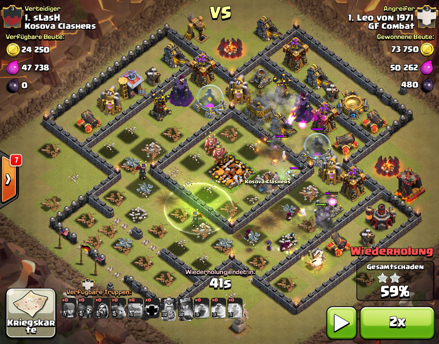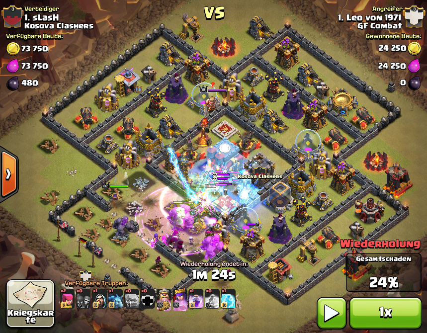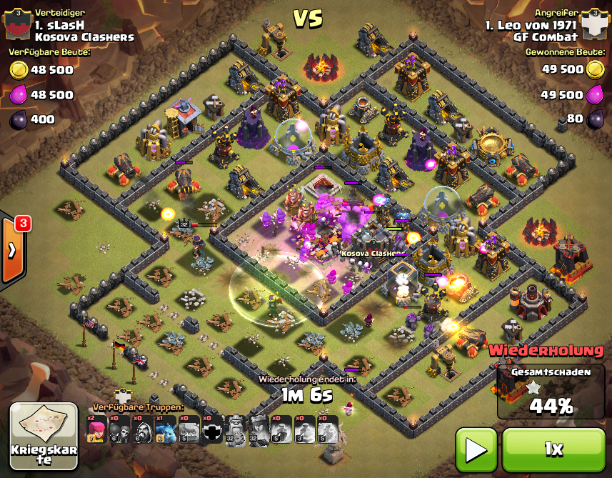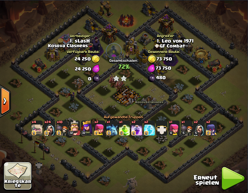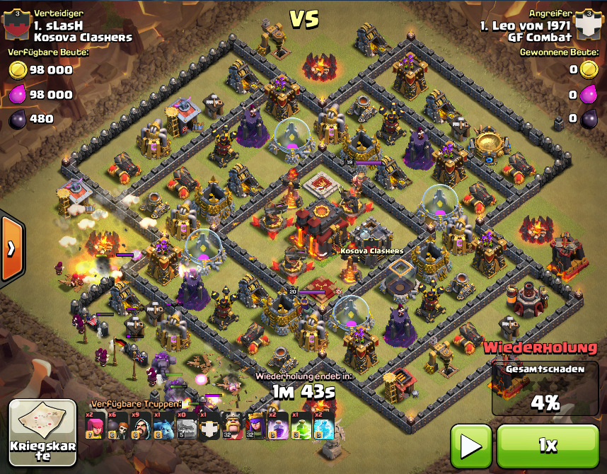 4 Golems an die SW-Flanke, Magier hinterher, Mauer an 2 Stellen aufbrechen, mehr Magier, mehr MB, 2. Mauer aufbrechen, CB entlassen, Helden rein, restliche Magier ... dann gleich Sprungzauber setzen, Wut, Frost und ab ins Zentrum ... wo nur noch Blitzlichter zu sehen waren. Dabei ging gottseidank auch das RH drauf, und überhaupt war das Zentrum nachher ganz saubergefegt und die restlichen Magier und Hexen halfen den Golems noch beim Wegräumen.