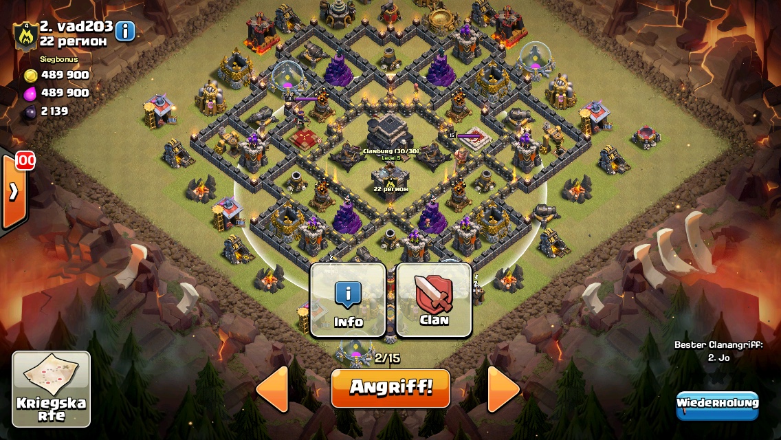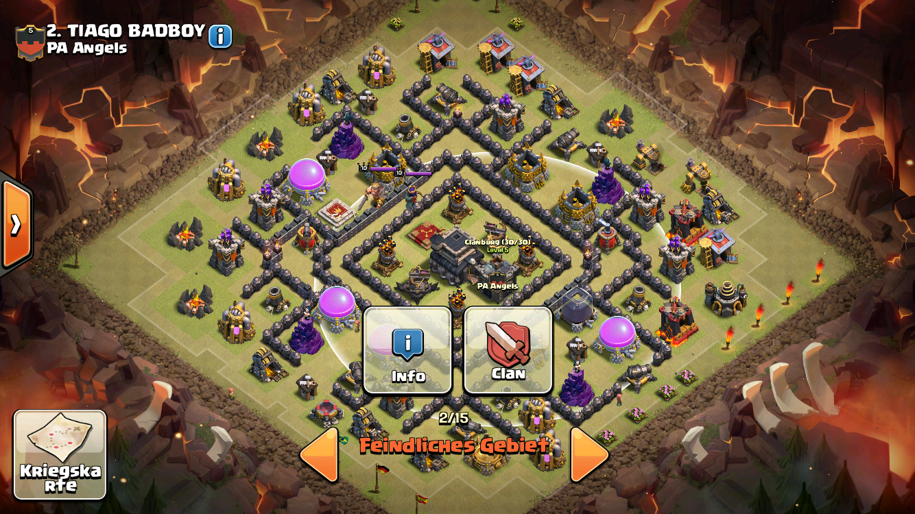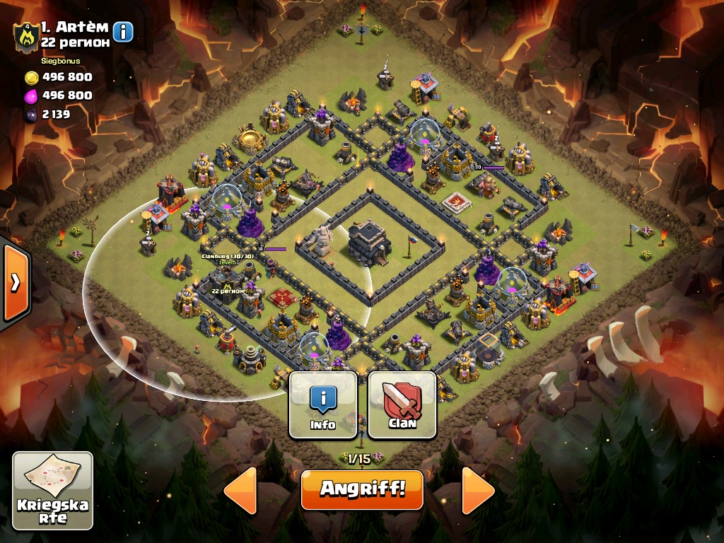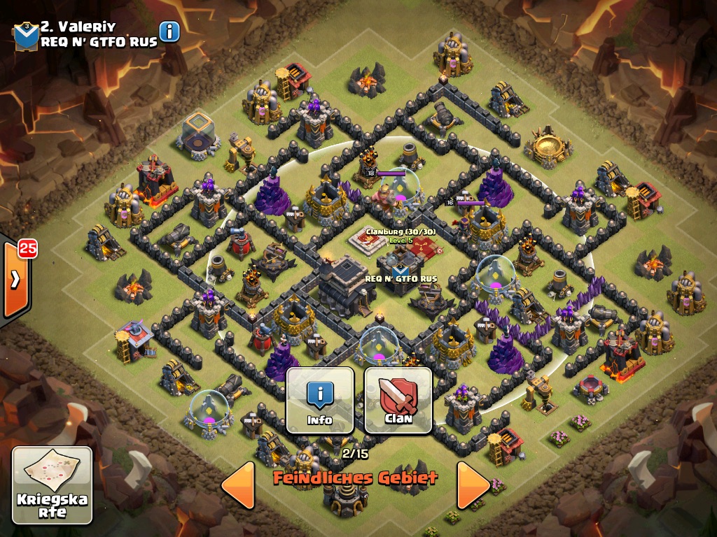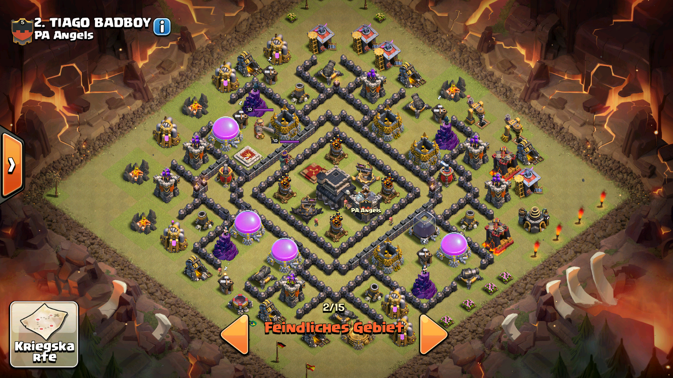Heute geht der Krieg los und ich bräuchte weitere Ideen für diese Base! Momentan habe ich mir noch keinen Plan überlegen können. Die Königin zu Killen wird net einfach sein, da die meisten Def gebäude draussen stehen und die Truppen nicht nach innen ziehen werden.