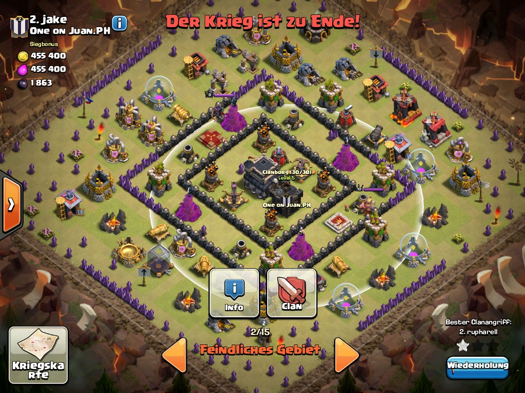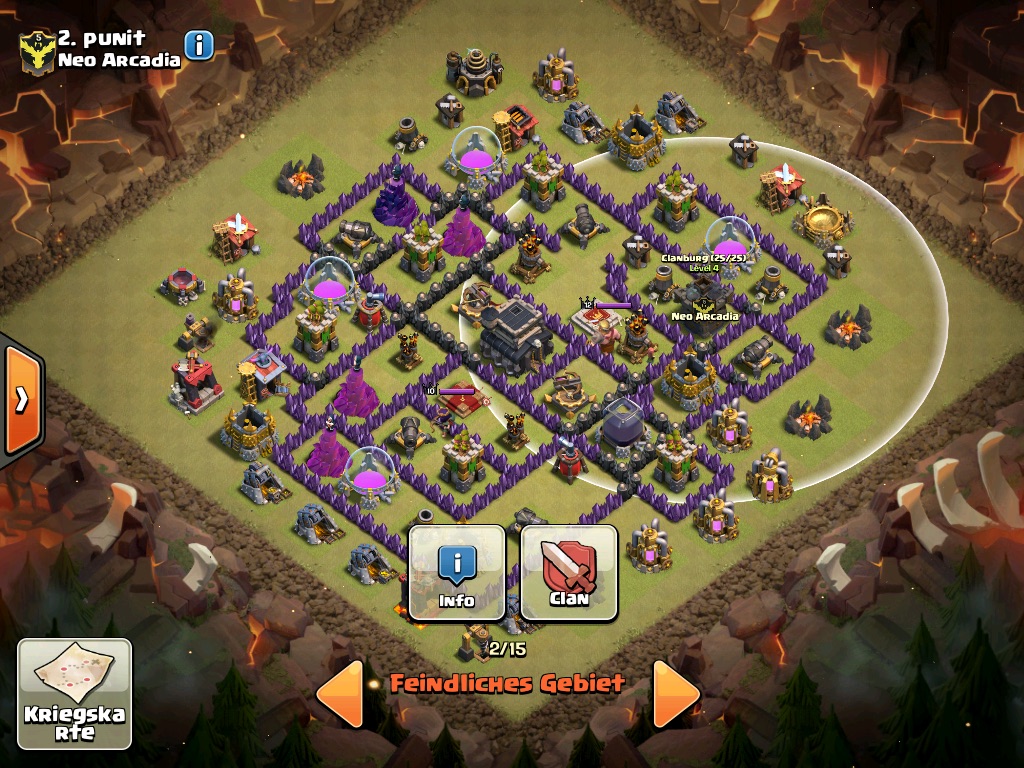 Bin bei der Base ein wenig ratlos, mit gowipe sind 2 Sterne locker drin würde aber gerne mit Hybrid auf 3 Sterne gehen, was sind eure Ideen? Würde von 3 Uhr mit 3 golems rein 14 Magier und 2 pekka mit Sprung in die Mitte rein von 9 Uhr dann mit 8 schweinen und Heil ein paar Def Gebäude killen.