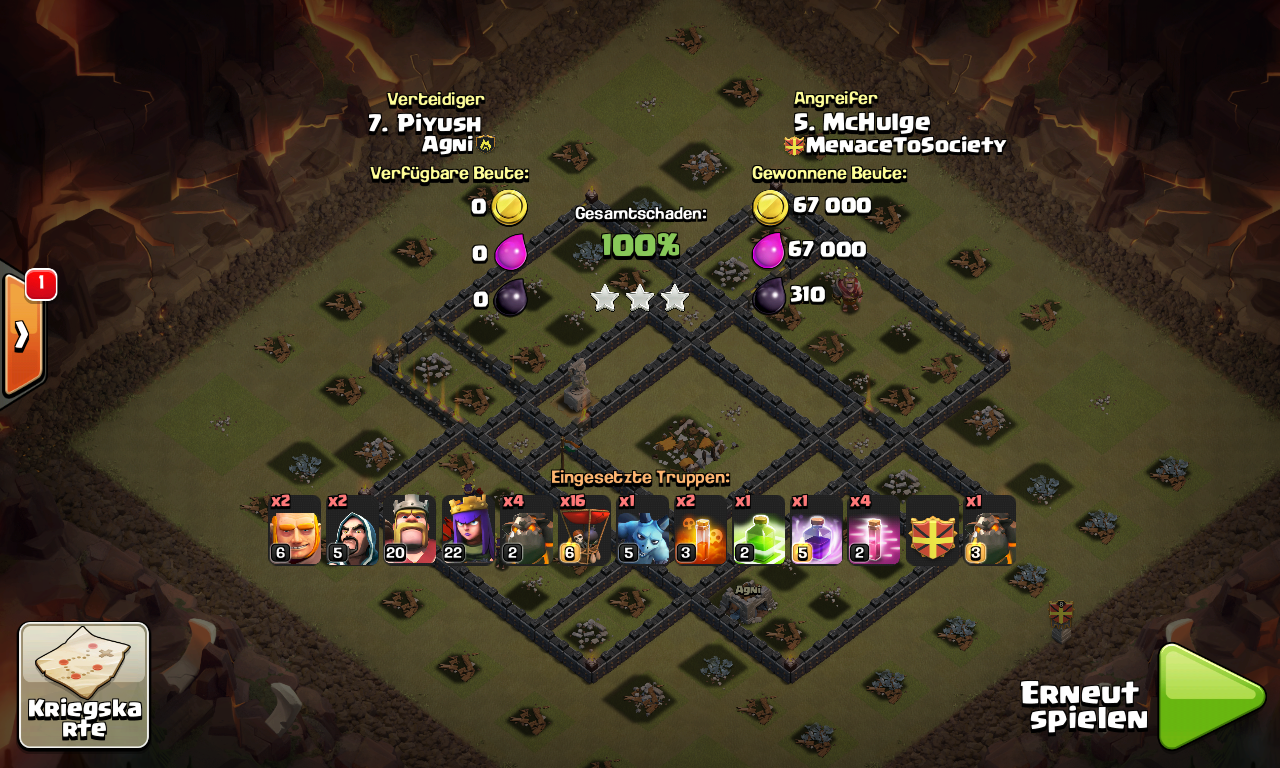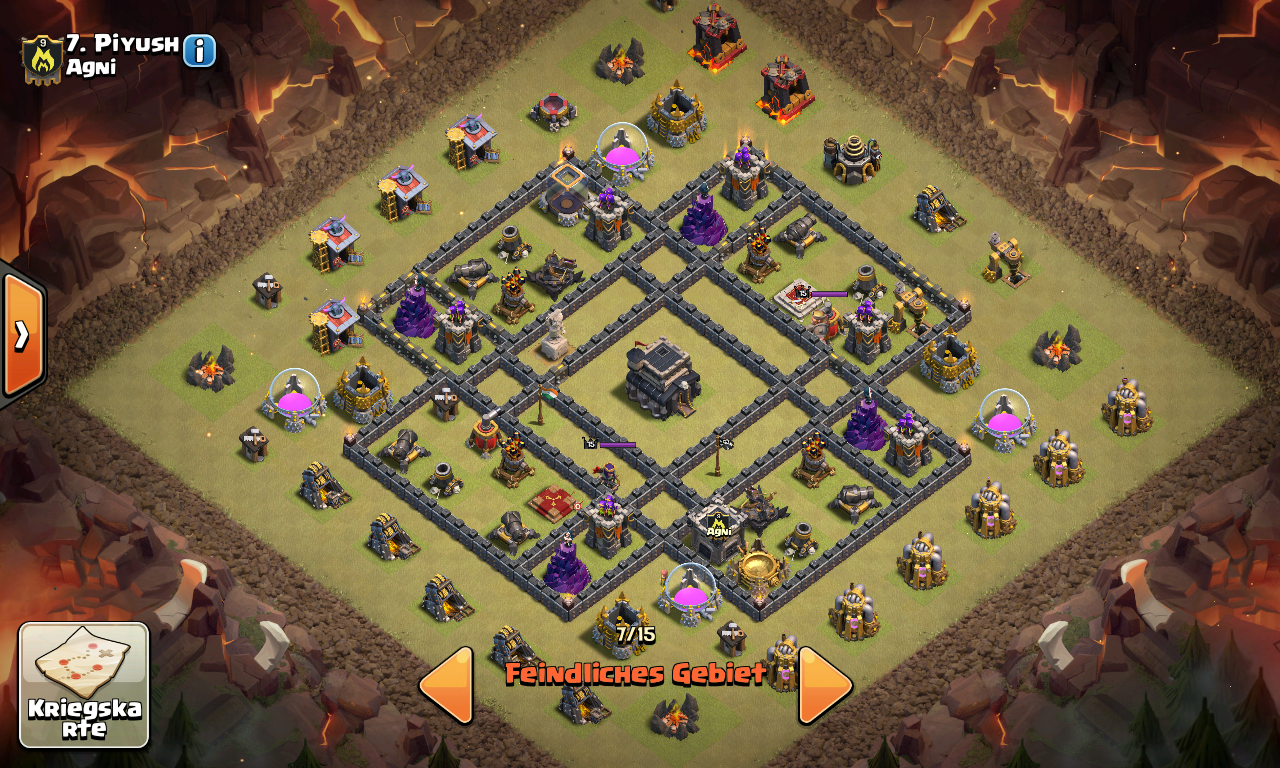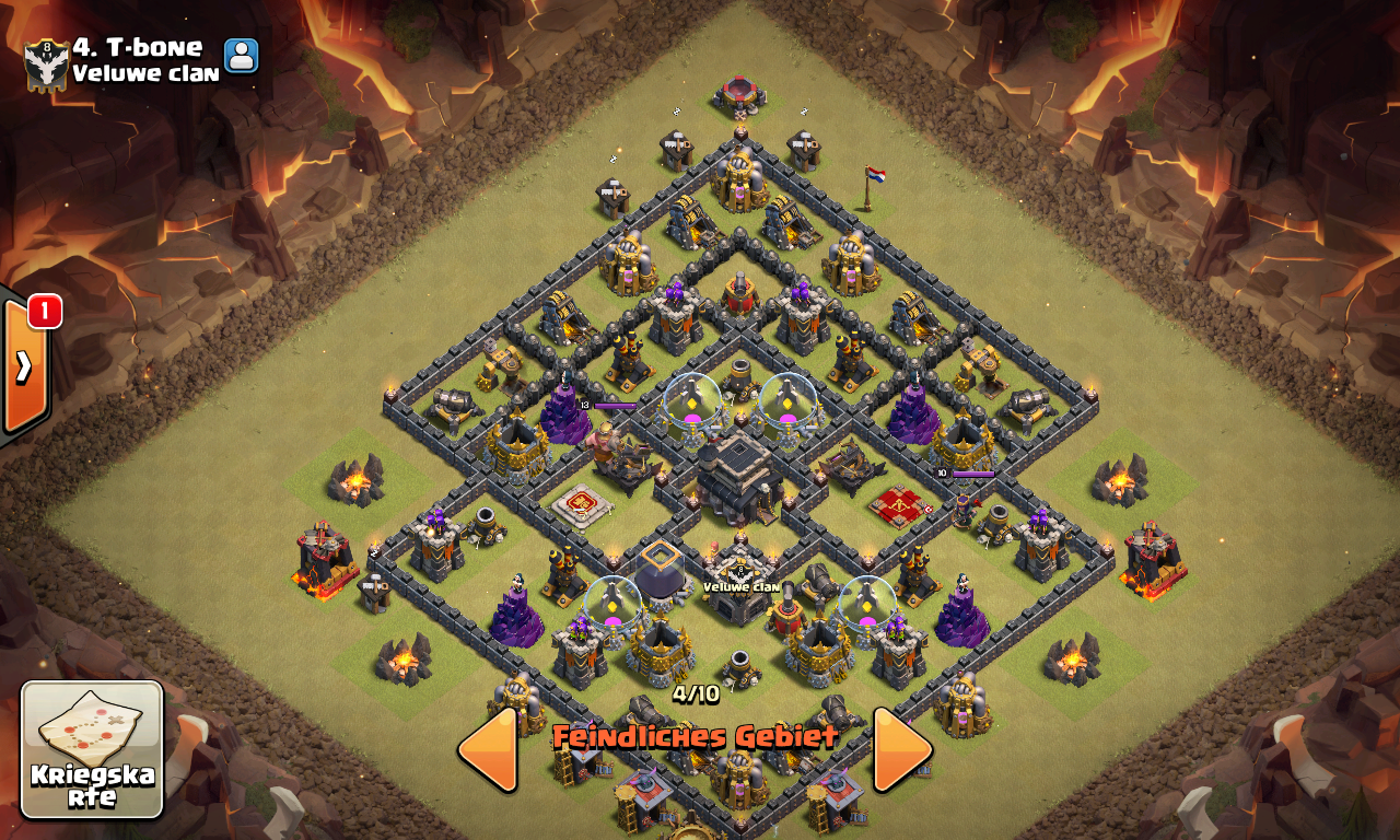 hallo ihr lieben, ich habe die Befürchtung dass ich bei dieser base auf die Nase Falle. Hat hier evtl jemand schon mal Erfahrung mit gemacht?? Die Gegner cb ist kein Thema, ich dachte daran mit den ks bei der Queen rein zu gehen und mittels jump den KS rechts Richtung x Bogen zu bringen, die anderen beiden Abteile dann mit hogs zu plätten, was meint ihr? Tesla stehen vermutlich in den leeren Boxen und die Riesenbomben hoffentlich einzeln daneben. Habt ihr evtl einen alternativ Vorschlag?? Meine Truppen sind max th9, queen22, king 20. über Vorschläge würde ich mich freuen Gruß, McHulge
