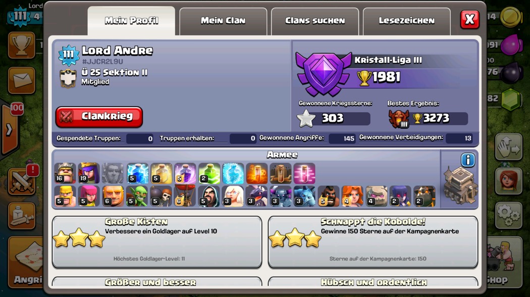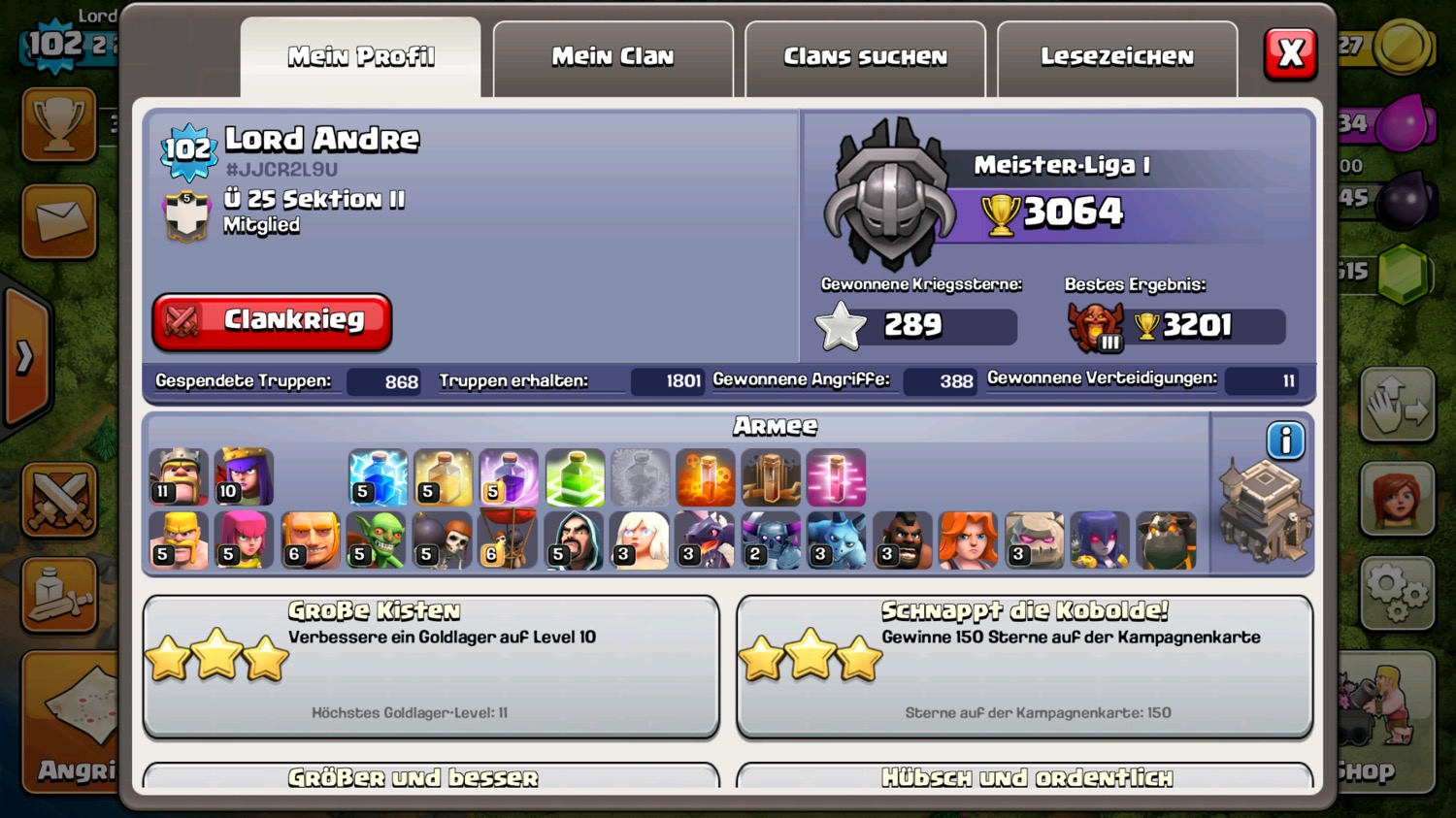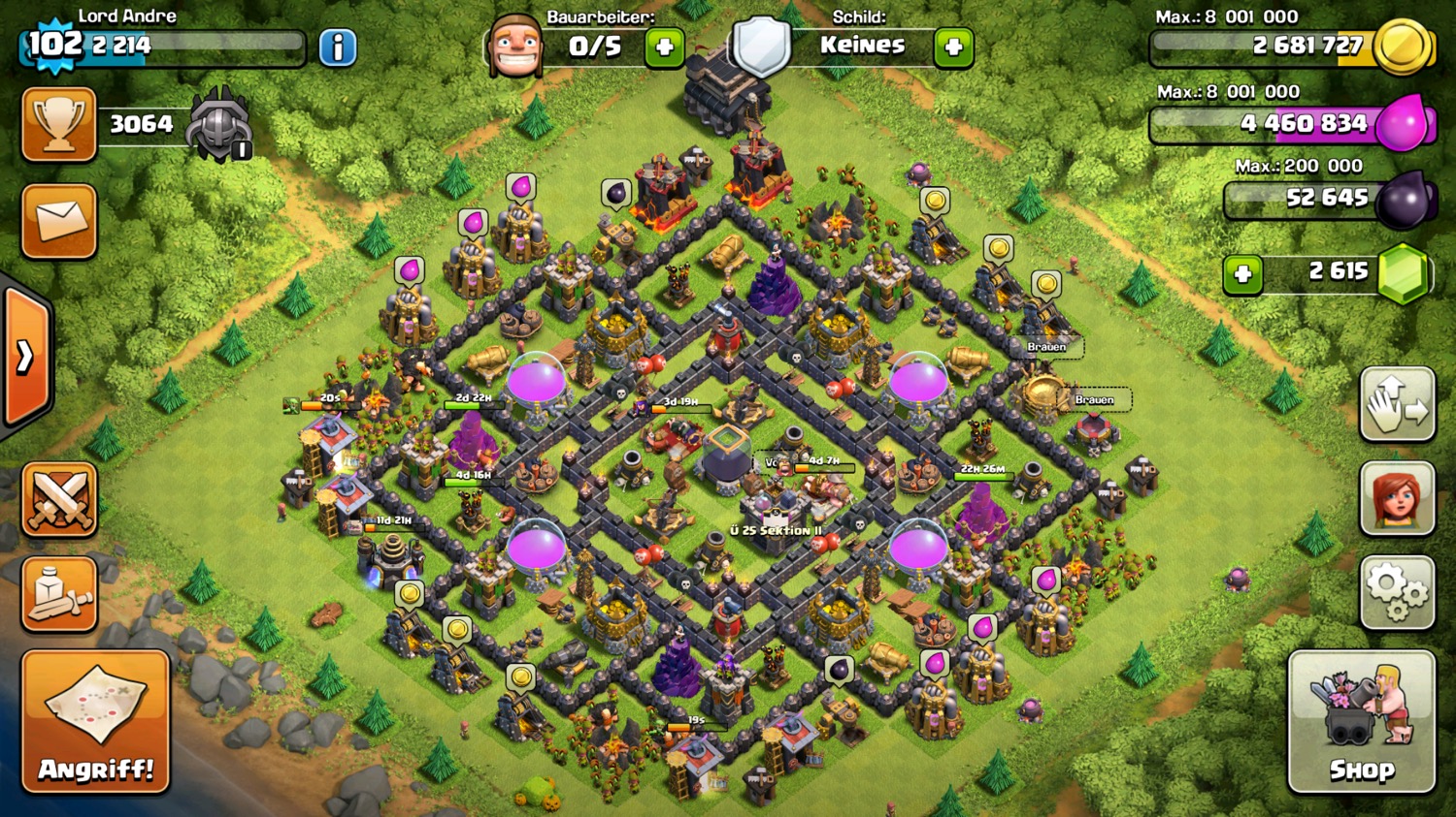 Momentan bin ich am mauern und helden hochziehen. Die def gebäude werd ich bald fertig max haben. Bei den truppen besteht noch guter nachhol bedarf