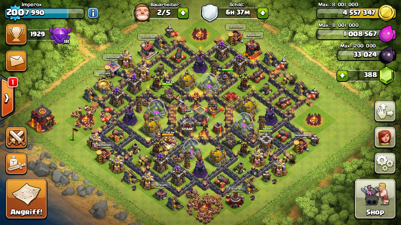 Mein aktueller Accountlevel ist bei Level 200 und das Rathaus Level 10. Habe das Dorf fast komplett ausgebaut.