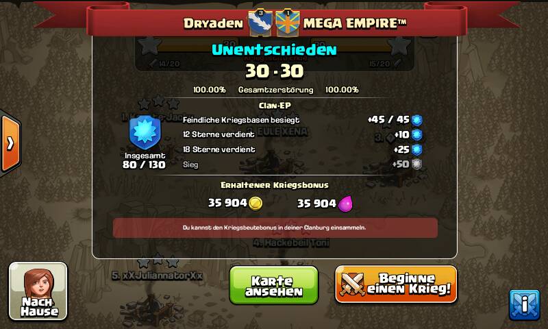 Haben jetzt zum 2. Mal einen Mega CK gemacht mit den Kriegern, 50: 50, und den ersten sogar gewonnen...2. läuft nicht sogut, aber es gibt ne Menge EP - Punkte...