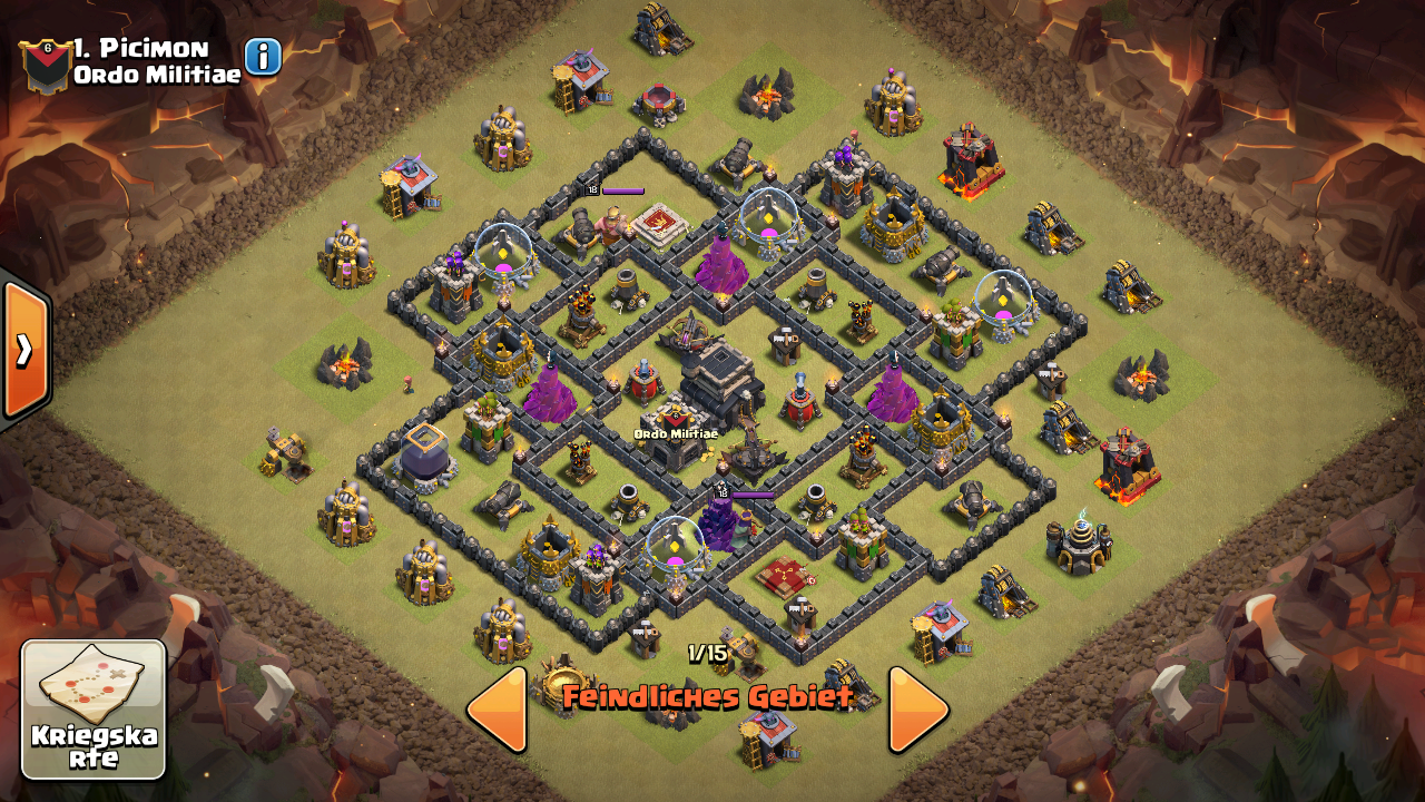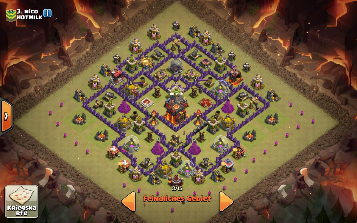 als würde es reichen für einen Sieg. Hab zuerst CB Truppen rausgelockt und mit Giftzaubern erledigt, danach bin ich mit Lavahunden auf 21 und 14 Uhr rein dahinter die Loons und meine beiden Helden hab ich bei der Königin reingschickt. -